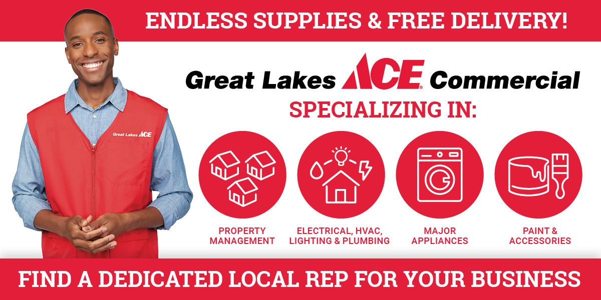 Neighborhood experts who can connect you with the quality, quantity and pricing you need. Get started here! Our dedicated experts will work with you to understand your unique business supply needs. We will set you up with all the brands you know and trust, in the right quantities at the right price. We offer customized solutions to keep you productive and convenient services to keep you operating efficiently. Talk to a Great Lakes Ace Hardware team member in any store today.