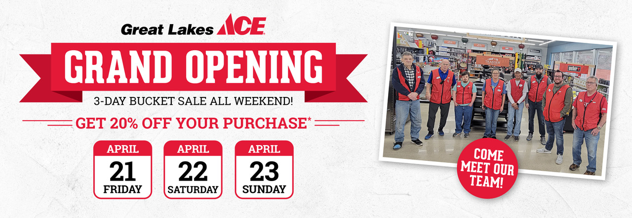 - Great Lakes Ace Tool Demo starts at 10 AM - try out some outdoor power equipment with the team from Ace