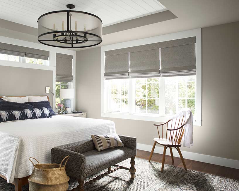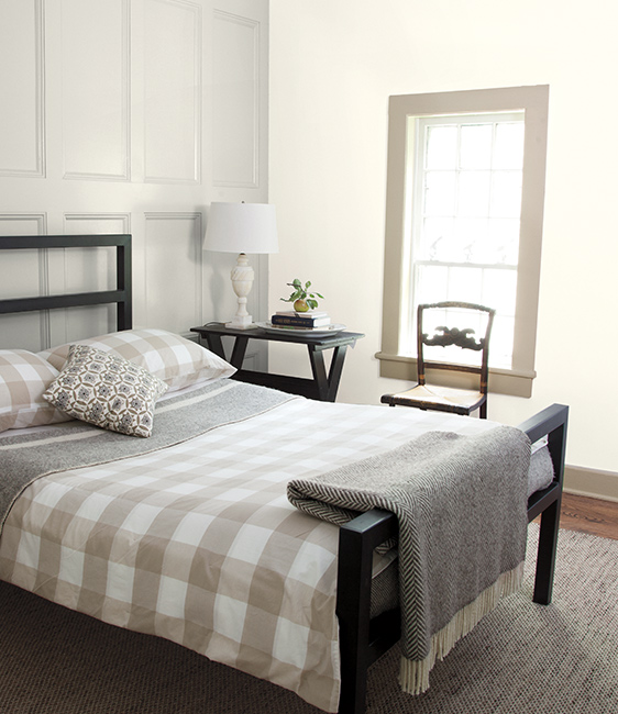 Inherently sophisticated, Natural Cream OC-14 serves as a canvas to frame the window trim painted in Thunder AF-685. The subtle contrast adds a touch of depth and dimension to this restful bedroom.