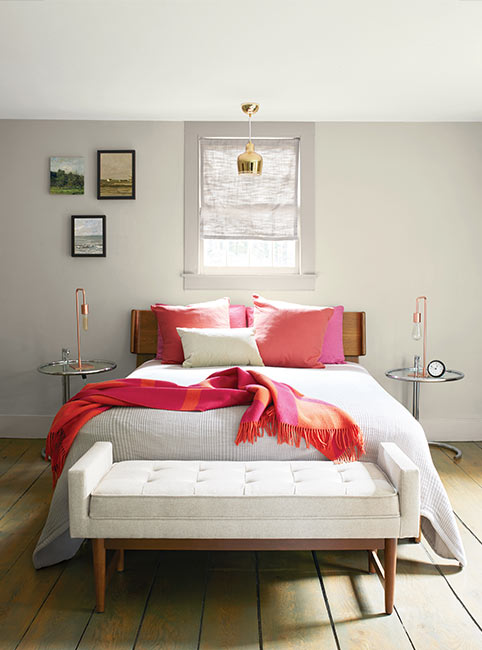A warm white, and former Benjamin Moore Color of the Year, Simply White OC-117 layers beautifully with other off-whites and grays to create a cozy, peaceful space.