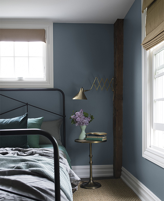 Restorative Yarmouth Blue HC-150 acts as a soft, enveloping, light blue blanket in this inviting bedroom.
